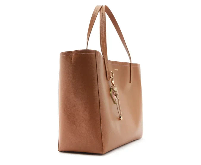 Bolsa Shopping grande marrom com maxi chaveiro. O modelo de tamanho G é feito em material similar ao couro, com efeito soft. Com shape retangular, possui duas alças de mão reforçadas. Possui fecho superior por botão de pressão com ímã. Traz bolsinho interno com fechamento em zíper, facilitando o manuseio e armazenamento de pequenos itens. Apresenta detalhe em costura pespontada em toda a borda superior da peça, com assinatura Anacapri em carimbo metálico, centralizada na capa frontal. Acompanha bag charm emborrachado com cordão Anacapri, removível por mosquetão. O acessório pode ser utilizado separadamente da bolsa.