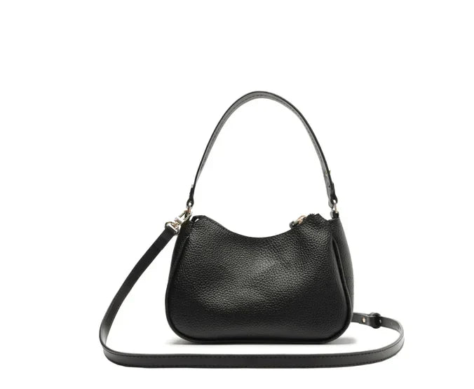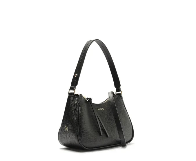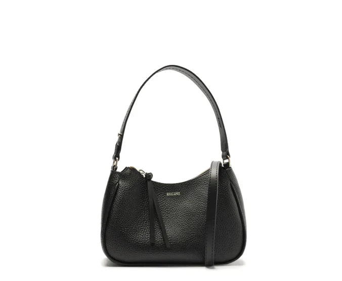 Bolsa tiracolo baguete média e arredondada, na cor preta. De shape trendy estilo meia-lua, o modelo possui duas alças: uma transversal, regulável e removível - e outra alça de ombro com aplicação de meia argola personalizada. Essa bolsa “dois em um” pode ser usada a tiracolo ou como bolsa baguete. De material similar ao couro com efeito texturizado, ela possui forro interno especial com estampa animal print de oncinha, fecho superior em zíper com puxador em tira dupla e detalhe em cápsula metálica Anacapri em alto relevo, aplicado na lateral da peça. Com bolsinho interno, com espaço para acomodar cartão. Traz assinatura Anacapri em relevo, centralizada na parte superior da capa frontal.