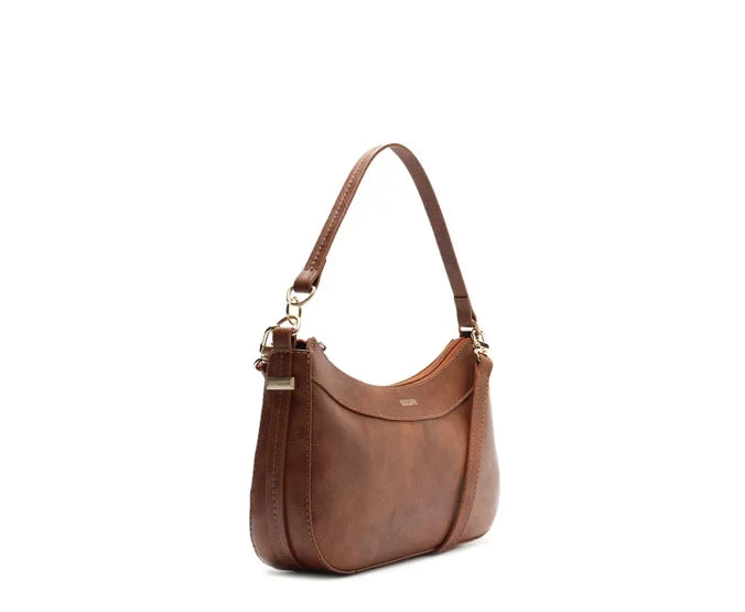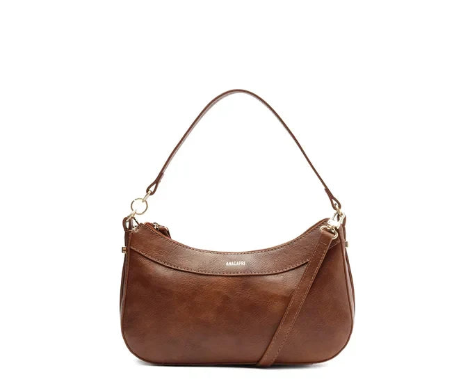 Bolsa tiracolo baguete média com detalhe em pespontos, na cor marrom. De shape trendy estilo meia-lua, o modelo possui duas alças: uma transversal, regulável e removível - e outra alça de ombro com aplicação de argola metálica em um dos lados. Essa bolsa “dois em um” pode ser usada a tiracolo ou como bolsa baguete. De material similar ao couro com efeito texturizado, ela possui forro interno, fecho superior em zíper com puxador em tira e detalhe em costura contrastante por toda a peça. Com aplicação de metal personalizado nas laterais, traz assinatura Anacapri em carimbo metálico, centralizada na capa frontal.