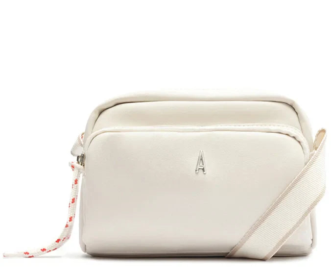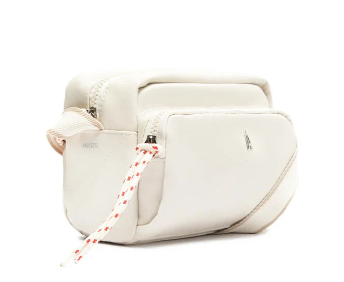 Bolsa tiracolo média com bolso em zíper, na cor branca. De shape retangular com acabamento arredondado nos cantos, o modelo possui uma alça transversal e regulável em fita de gorgurão. De material similar ao couro e forrada na parte interna, apresenta bolso externo, traz fechos superiores em zíper esportivo com puxador em atacador bicolor, com detalhe em costura ornamental no foles e carimbo Anacapri. O modelo traz aplicação de pin metálico com inscrição da inicial “A” - assinatura Anacapri, centralizado na capa frontal do bolso externo.
