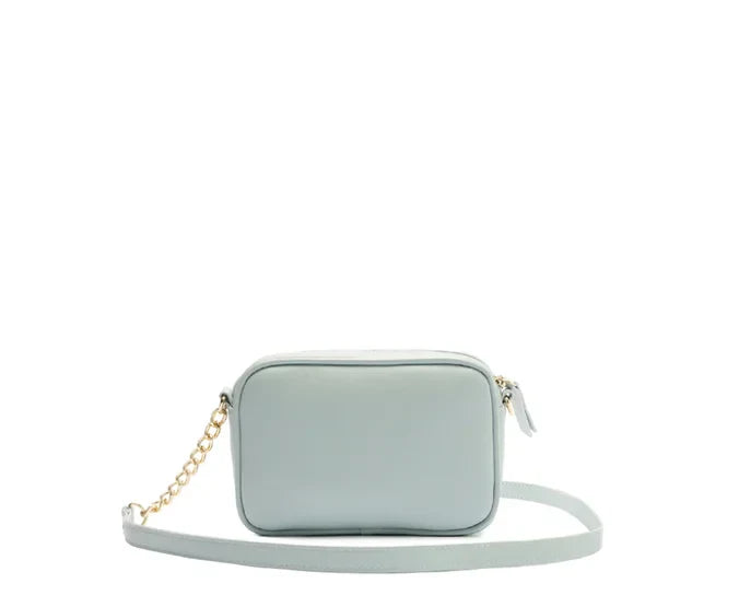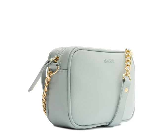 Bolsa Tiracolo Pequena Essencial Azul Drizzle. Na cor azul, possui alça longa à tiracolo e com detalhe de corrente dourada, além de abertura em zíper de metal. Contém gravação com o nome da marca na parte superior.