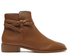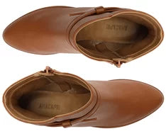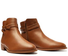 Bota Cano Curto Salto Baixo Tiras Marrom. O modelo possui solado baixo emborrachado, com salto baixo. De biqueira arredondada, traz design imponente de recortes no cabedal e na lateral do cano. Detalhe para aplicação de tiras superiores que contornam o cano, conectadas por tira fina presa na lateral, com fechamento em zíper metálico na outra lateral do cano.