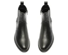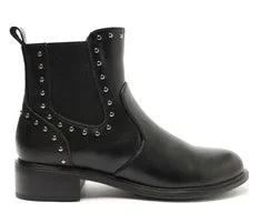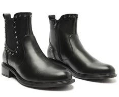 Bota Chelsea Cano Curto Tachas Preta. O modelo tem cano curto, salto baixo em bloco e bico redondo. Traz cabedal liso e elásticos largos nas laterais interna e externa do cano, com detalhe para aplicação de tachas metálicas no contorno das laterais e no calcanhar. O modelo possui tira com puxador na parte traseira, facilitando o calce.