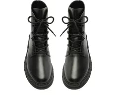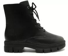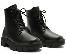 Bota Coturno Cano Curto Tratorada Lisa Preta. O modelo tem cano curto, biqueira arredondada e salto baixo emborrachado, tratorado, bipartido e robusto preto. Traz cabedal ajustado ao pé, com fecho em atacadores de mesmo tom. Com design de recortes discretos no cabedal e costura pesponto nos contornos.