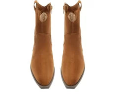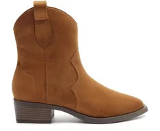 Bota Western Cano Curto Camurça Marrom. O modelo de cano baixo possui salto em bloco baixo em fachete e bico arredondado. Traz detalhes com design de recortes nas laterais. Possui fechamento lateral em zíper e traz tira como puxador na lateral do cano, facilitando o calce.