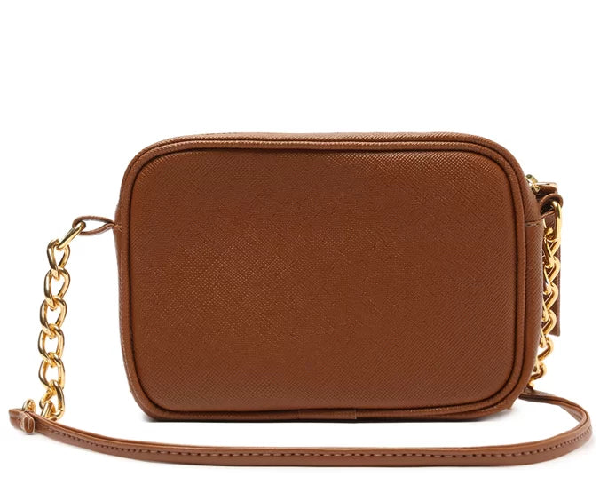 Crossbody pequena essencial. Na cor marrom, possui alça longa à tiracolo e com detalhe de corrente dourada, além de abertura em zíper de metal. Contém gravação com o nome da marca na parte superior.