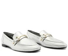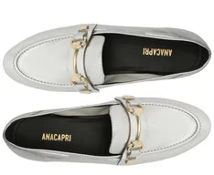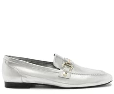 Mocassim Anacapri com detalhe em bridão e pala removível, na cor prata. O modelo possui bico arredondado e aplicação de tira fina com recorte na gáspea. Versátil, com tira removível, o mocassim Anacapri possibilita dois formatos de uso: o tradicional com a tira fina com detalhe em recorte vazado ou com a tira extra com o clássico bridão metálico para troca. De solado baixo emborrachado com leve saltinho, o sapato é fechado, cobrindo todo o pé.