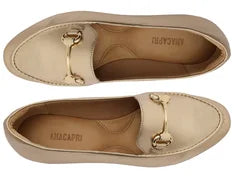 Mocassim ANACAPRI dourado em material similar ao couro. Possui bico arredondado e aplicação de bridão metálico na gáspea. Salto baixo emborrachado. Fechado, cobre todo o pé.