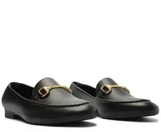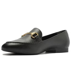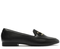 Mocassim ANACAPRI preta em material similar ao couro. Possui bico arredondado e aplicação de bridão metálico na gáspea. Salto baixo emborrachado. Fechado, cobre todo o pé.