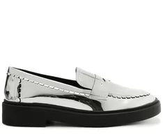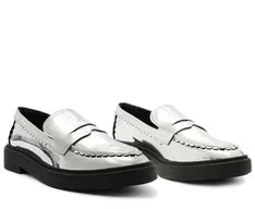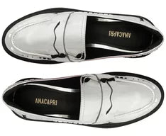 Mocassim Specchio Bold Prata. O modelo robusto e estruturado possui solado baixo e emborrachado, com bico arredondado. Feito em material similar ao couro com acabamento envernizado, traz aplicação de tira com recorte vazado na gáspea. Apresenta palmilha com assinatura Anacapri.