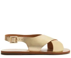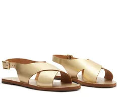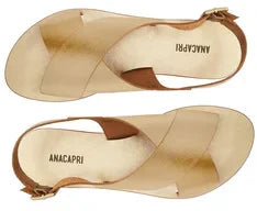 Sandália monocolor de tiras cruzadas na cor dourada. O modelo de material similar ao couro, possui duas tiras largas na gáspea que se cruzam e seguem até a pala abraçando o tornozelo, com uma tira mais fina que contorna o calcanhar, com fecho regulável em fivela de metal quadrada na lateral. Apresenta palmilha marrom com assinatura Anacapri. Deixa os dedos e calcanhar à mostra.