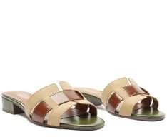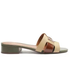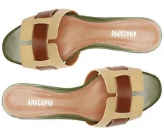 Sandália Mule Tira H Multineutra Bege e Verde. O modelo de material similar ao couro apresenta cabedal com tira larga com design em H, trazendo recortes vazados sobre os dedos com aplicação de uma tira fina centralizada marrom. De bico redondo e salto em bloco baixo. Apresenta palmilha emborrachada verde, com assinatura Anacapri. Aberta, deixa os dedos e calcanhar totalmente à mostra.