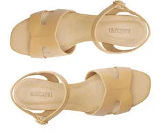 Sandália com tira em H e detalhe de recortes, na cor bege. O modelo de material similar ao couro, possui salto médio em bloco e biqueira quadrada. Traz cabedal em tiras vazadas sobre os dedos, com design imponente em H, com detalhe em costuras pesponto por todo o contorno. Possui tira traseira no contorno do calcanhar que se conecta na tira do tornozelo, com fecho superior em fivela lateral. Com palmilha bege e inscrição Anacapri. Aberta, exibe todo o pé.