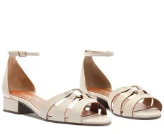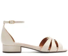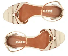 Sandália Anacapri de salto bloco com recortes vazados e detalhe em fivela, na cor branca. O modelo de salto em bloco baixo possui biqueira arredondada - com design de recortes vazados - em trio de tirinhas finas sobre os dedos. De material similar ao couro com acabamento envernizado, traz contorno superior com costura pesponto delicado e aplicação de fivela metálica redonda na gáspea. Fechada no calcanhar, possui tira fina que contorna o tornozelo, com fecho lateral por fivela metálica. Apresenta palmilha marrom, com assinatura Anacapri. A sandália deixa parte dos dedos e laterais à mostra.