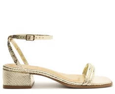 Sandália Salto Bloco Textura Dourada. O modelo de biqueira quadrada traz cabedal e salto em bloco baixo forrado com estampa animal print de cobra. Com tira dupla sobre os dedos, traz tiras laterais que contornam o calcanhar e se conectam à tira no tornozelo, com fechamento superior em fivela lateral. Apresenta palmilha preta, com assinatura Anacapri.