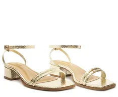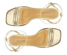 Sandália Salto Bloco Textura Dourada. O modelo de biqueira quadrada traz cabedal e salto em bloco baixo forrado com estampa animal print de cobra. Com tira dupla sobre os dedos, traz tiras laterais que contornam o calcanhar e se conectam à tira no tornozelo, com fechamento superior em fivela lateral. Apresenta palmilha preta, com assinatura Anacapri.