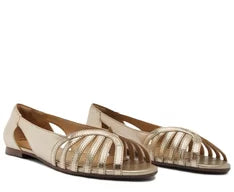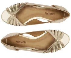 Sapatilha Peep Toe Recortes Vazados Dourada. O modelo peep toe - aberto na parte da frente mostrando os dedos - possui bico arredondado com design de recortes vazados em tirinhas finas no cabedal. De material similar ao couro com acabamento metalizado. Ajustada e com recortes imponentes nas laterais, tem contorno superior com costura pesponto delicado e assinatura Anacapri na palmilha. Fechada atrás, o modelo deixa o peito de pé, laterais e dedos totalmente á mostra.
