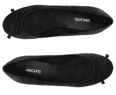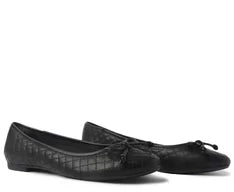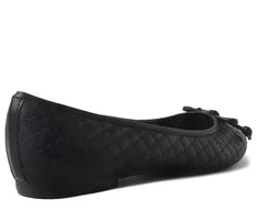 Sapatilha preta. O modelo tem salto rasteiro e bico redondo. Traz cabedal todo matelassado com pespontos finos. Com recorte redondo no peito do pé e laço em fio de couro.