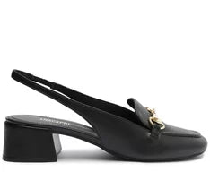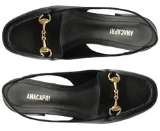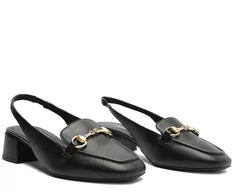 Sapatilha Slingback Salto Bloco Bridão Office Preta. O modelinho possui salto em bloco baixo e biqueira quadrada. Apresenta cabedal com recorte reto sobre o peito do pé, com formato ajustado nas laterais. Aberta atrás, possui tiras finas conectadas ao cabedal que seguem pelas laterais contornando o calcanhar, com detalhe elástico que se ajusta no calce. Com palmilha nude e assinatura Anacapri.
