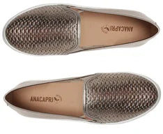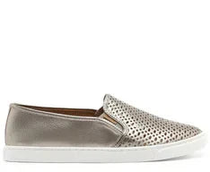Tênis estilo slip on na cor prateada, com solado branco flat. De material Eco Montreal Vegano com recorte a laser na gáspea e fechado no restante do cabedal. Fechado no calcanhar também. Recortado na pala, traz elásticos que facilitam o calce.